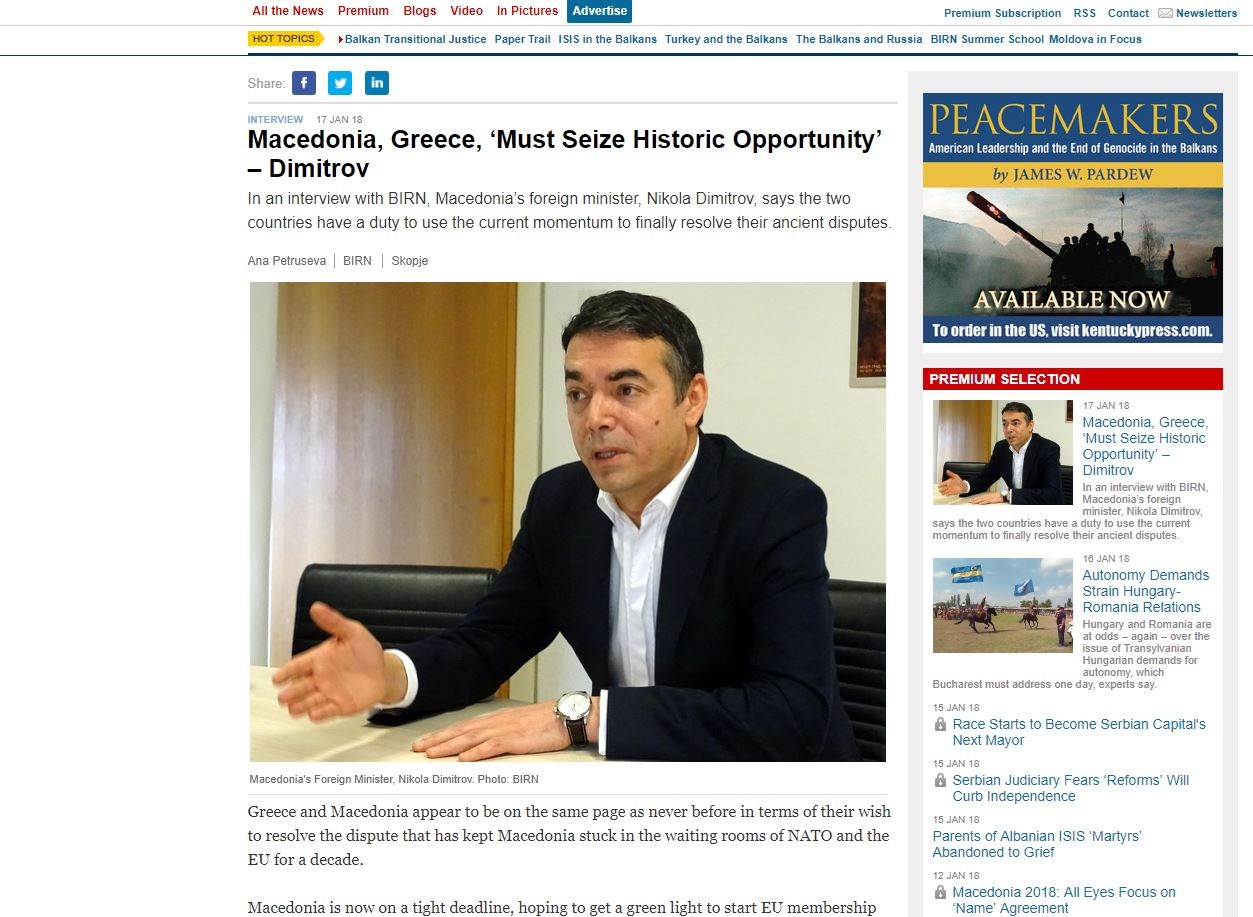Την ώρα που υπάρχει διάχυτη αισιοδοξία πως επίκειται λύση στο θέμα της ονομασίας των Σκοπίων, ο υπουργός Εξωτερικών της χώρας, Νικολά Ντιμιτρόφ σε συνέντευξη του στην ιστοσελίδα, “Birn” αναγνωρίζει τον κίνδυνο να χρειαστεί το θέμα να περιμένει για μια πιο κατάλληλη στιγμή. Επισημαίνει, ωστόσο, ότι τόσο τα Σκόπια όσο και η Αθήνα έχουν καθήκον να κάνουν το καλύτερο δυνατό και να εκμεταλλευτούν την τρέχουσα δυναμική.