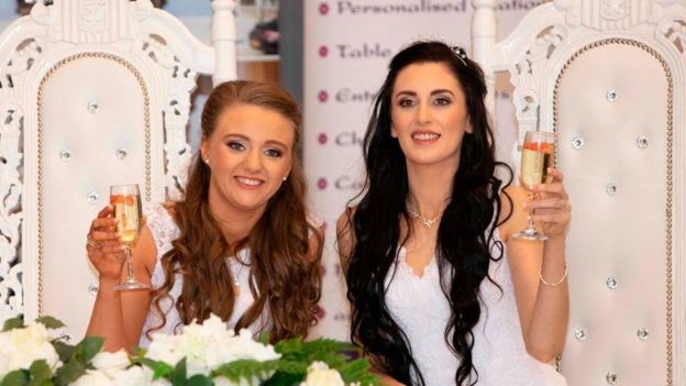 Η Ρόμπιν Πιπλς, 26 ετών και η Σάρνι Έντουαρντς, 27 ετών, ενώθηκαν με τα δεσμά του γάμου το απόγευμα στην πόλη Καρικφέργκους, κοντά στο Μπέλφαστ, επωφελούμενες από τον νέο νόμο που τέθηκε σε ισχύ την Δευτέρα.