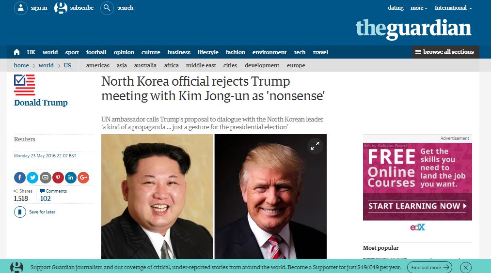 Ο υποψήφιος για το προεδρικό χρίσμα των Ρεπουμπλικανών, είχε δηλώσει πρόθυμος να συνομιλήσει με τον ηγέτη της Βόρειας Κορέας, σε μια προσπάθεια να σταματήσει την υλοποίηση του πυρηνικού προγράμματος της Πιονγκγιάνγκ.