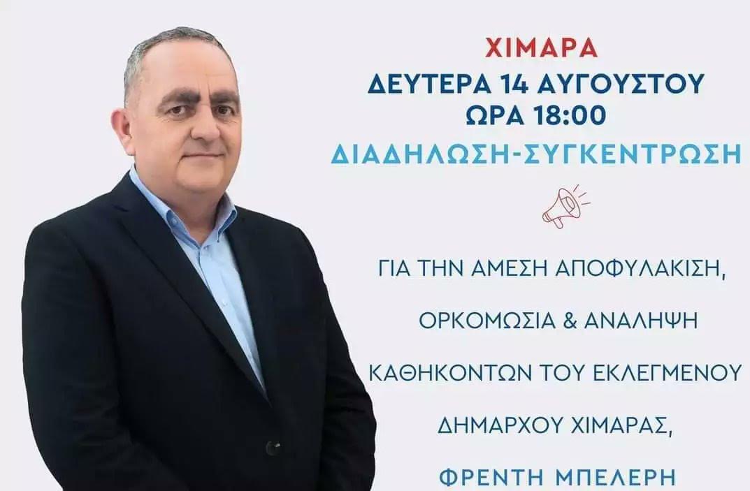 Για σήμερα Δευτέρα, 14 Αυγούστου, στις 17:00 ώρα Ελλάδας, έχει προγραμματιστεί μεγάλη συγκέντρωση στην Χειμάρρα, στα γραφεία της Ομόνοιας στον κεντρικό πεζόδρομο Σπηλαίων, εκεί όπου ήταν και το προεκλογικό κέντρο του Φρέντι Μπελέρη.