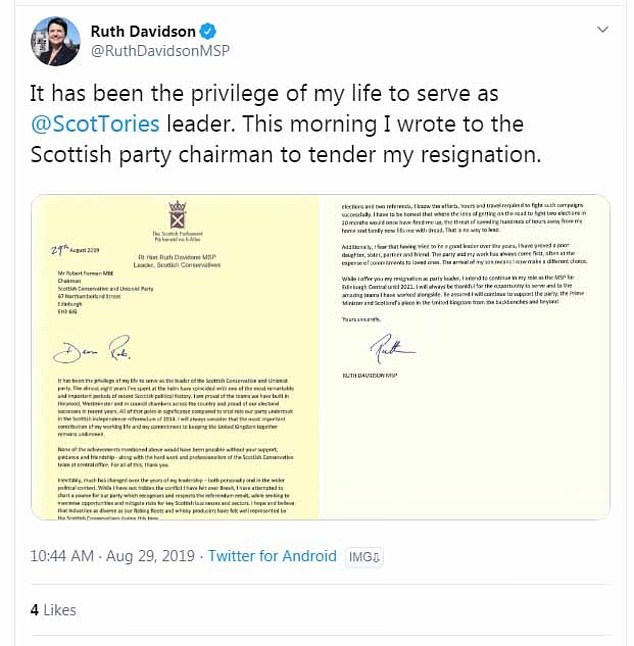 Στην επιστολή παραίτησής της, η Ρουθ Ντέιβιντσον αναφέρεται στην εσωτερική σύγκρουση που αισθάνθηκε για την υπόθεση του Brexit, αν και επικαλείται οικογενειακούς λόγους για την αποχώρησή της.