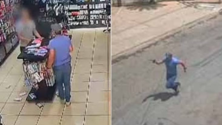 Σε ένα σημείο, όπως φαίνεται σε υλικό από άλλες κάμερες ασφαλείας, ο οργισμένος πατέρας έβγαλε ένα όπλο και πυροβόλησε στον αέρα. Ο φίλος της κόρης του κατάφερε να διαφύγει χωρίς να τραυματιστεί, ωστόσο το περιστατικό προκάλεσε πανικό στην περιοχή.