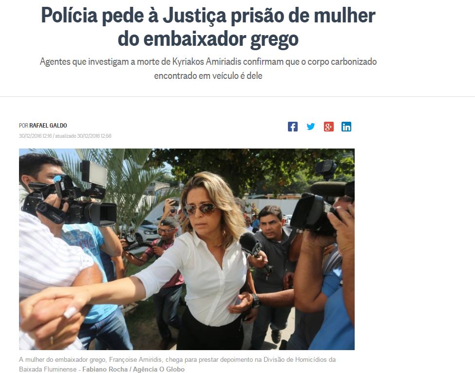 Οι αρχές της Βραζιλίας εξέδωσαν ένταλμα σύλληψης για τη σύζυγο του Έλληνα Πρέσβη, Κυριάκου Αμοιρίδη, Φρανσουάζ, όπως μεταδίδουν τα ΜΜΕ της χώρας.