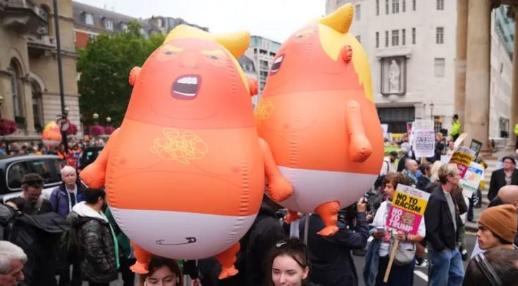 «Οι μετανάστες είναι ευπρόσδεκτοι, ο Τραμπ δεν είναι ευπρόσδεκτος», «Όχι στον ρατσισμό, όχι στον Τραμπ», «Βομβαρδίζετε παιδιά στη Γάζα και γιορτάζετε στο Ηνωμένο Βασίλειο», ήταν ορισμένα από τα συνθήματα που έγραφαν τα πλακάτ των διαδηλωτών.