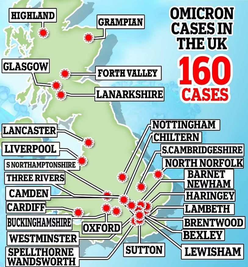 Η Βρετανία έχει εντοπίσει μέχρι σήμερα 160 κρούσματα της παραλλαγής Όμικρον. “Επί του παρόντος, η μεγάλη πλειονότητα των κρουσμάτων παρουσιάζει σαφή σχέση με ταξίδια από την Νότια Αφρική και τη Νιγηρία”, σύμφωνα με την ανακοίνωση της βρετανικής κυβέρνησης.