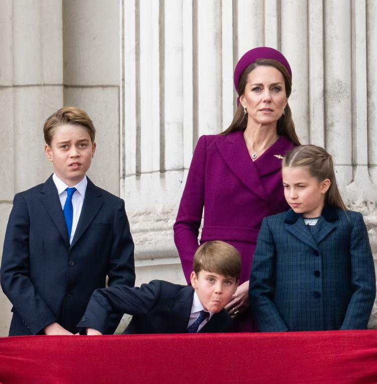 Η 43χρονη Κέιτ, στάθηκε μαζί με τα τρία παιδιά της, τον 11χρονο πρίγκιπα Τζορτζ, την 10χρονη πριγκίπισσα Σάρλοτ, και τον 7χρονο Λούις, για να παρακολουθήσουν την εντυπωσιακή πτήση της Βασιλικής Αεροπορίας για την 80ή επέτειο της Ημέρας της VE στο Λονδίνο σήμερα το απόγευμα.
