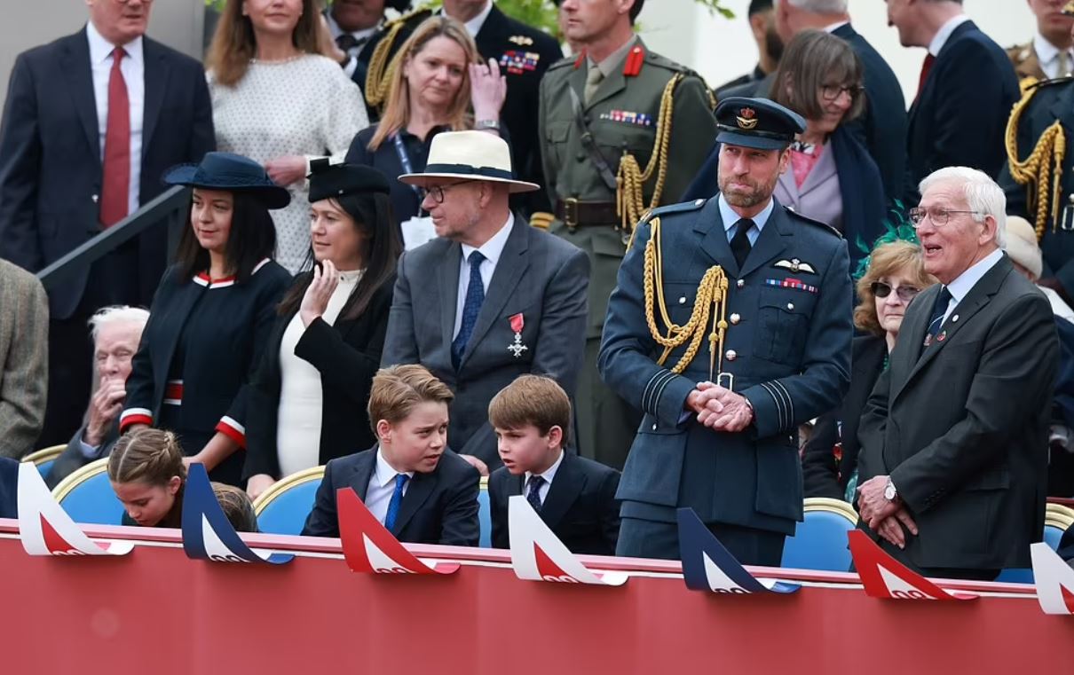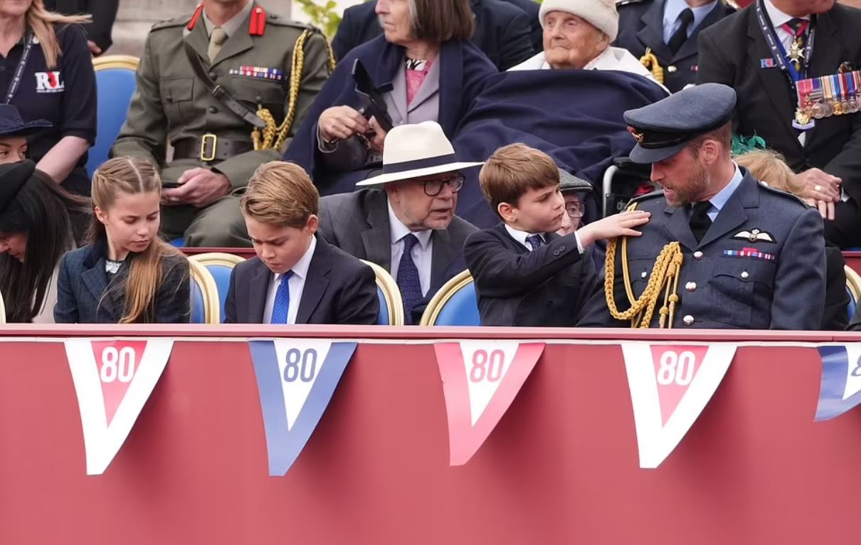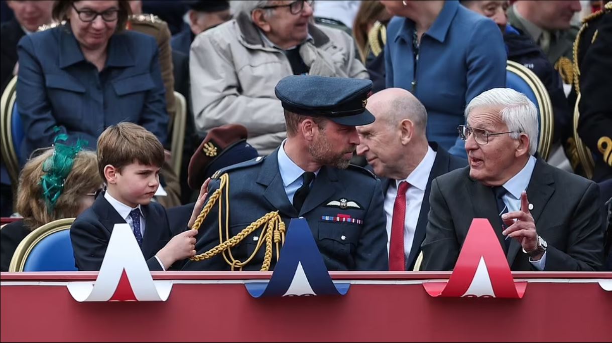 Κοιτάζοντας προς τον ουρανό, το μικρότερο από τα παιδιά του Ουίλιαμ και της Κέιτ έδειχνε δέος και ήταν στα καλύτερά του, ζωηρός, καθώς παρακολουθούσε την επίδειξη, η οποία ήταν μέρος των εκδηλώσεων μνήμης για το τέλος του Β’ Παγκοσμίου Πολέμου στην Ευρώπη.