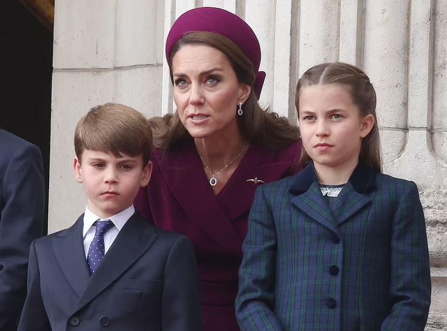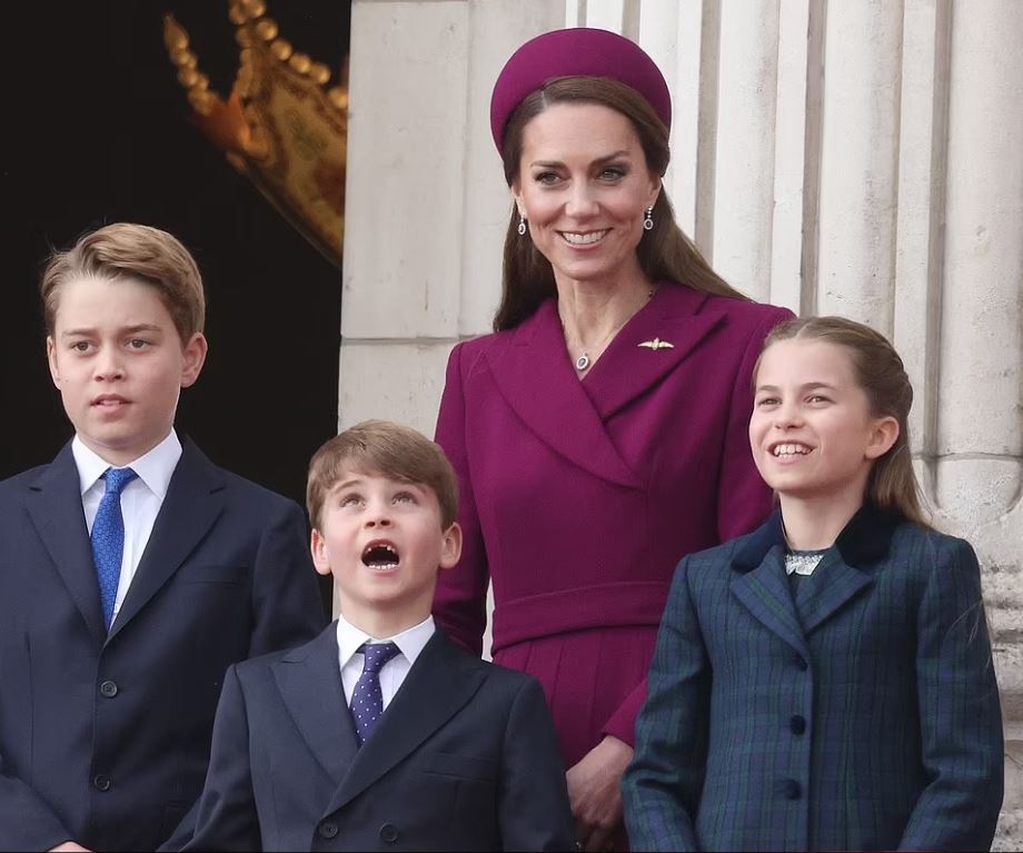Η 43χρονη Κέιτ, στάθηκε μαζί με τα τρία παιδιά της, τον 11χρονο πρίγκιπα Τζορτζ, την 10χρονη πριγκίπισσα Σάρλοτ, και τον 7χρονο Λούις, για να παρακολουθήσουν την εντυπωσιακή πτήση της Βασιλικής Αεροπορίας για την 80ή επέτειο της Ημέρας της VE στο Λονδίνο σήμερα το απόγευμα.