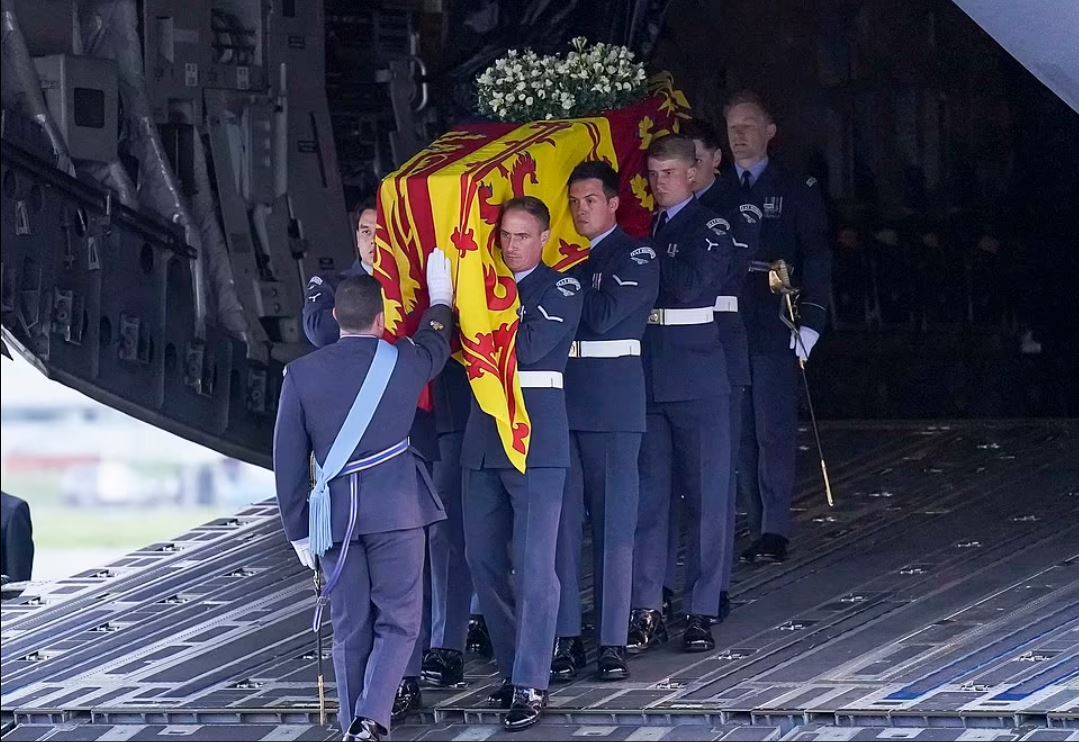 Στο αεροδρόμιο του Εδιμβούργου στις 13 Σεπτεμβρίου 2022, η βασίλισσα έγινε δεκτή από το Βασιλικό Σύνταγμα της Σκωτίας με βασιλικό χαιρετισμό, προτού μια ομάδα ανδρών από τη Βασιλική Πολεμική Αεροπορία μεταφέρει το φέρετρο από το αεροσκάφος – ένα RAF Globemaster C-17. Ο πρίγκιπας και η πριγκίπισσα της Ουαλίας επεφύλασσαν στα παιδιά τους μια μέρα με τζετ, ελικόπτερα και ιστορικά αεροπλάνα κατά τη διάρκεια της ημερήσιας εκδρομής. Ο Γουίλιαμ, 41 ετών, και η Κέιτ ήταν όλο χαμόγελα όταν έφτασαν με τους νεαρούς βασιλικούς στην αεροπορική επίδειξη, όπου τους υποδέχτηκε ο διοικητής πτέρυγας Will Essex. Τους υποδέχτηκε γκρίζος ουρανός που έφερε στη συνέχεια δυνατή βροχή.