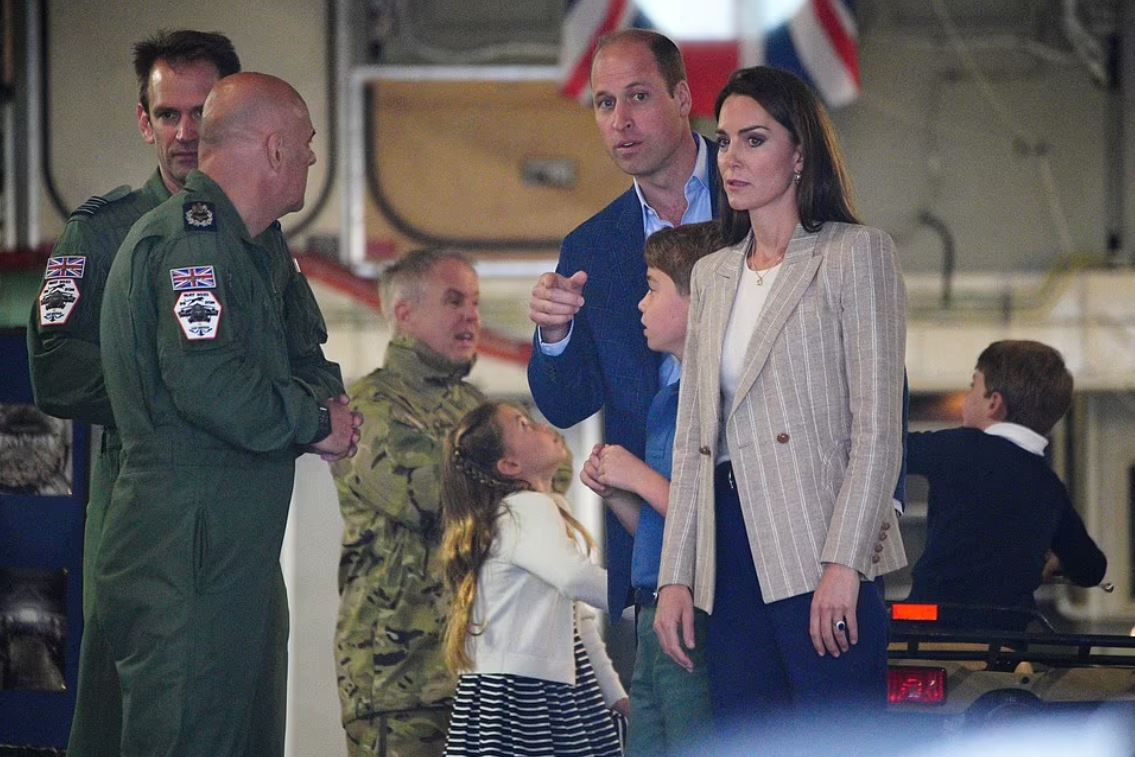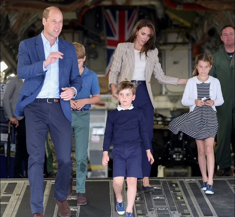Η πρώτη στάση της οικογένειας ήταν ένα τεράστιο μεταγωγικό αεροσκάφος C-17, το οποίο χρησιμοποιήθηκε για τη μεταφορά του φέρετρου της εκλιπούσας βασίλισσας από το Εδιμβούργο στο Λονδίνο τον περασμένο Σεπτέμβριο. Οι τρεις νεαρότεροι πρίγκιπες που δεν έχουν πλέον σχολείο σοβάρεψαν, καθώς περιηγήθηκαν στο αεροπλάνο, μαζί με τον πατέρα τους, πρίγκιπα Ουίλιαμ, 41 ετών.