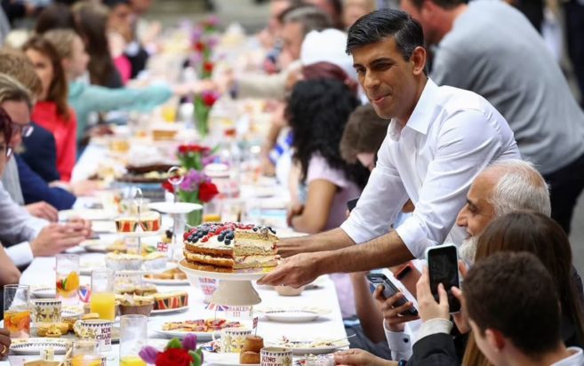 Το εντυπωσιακό συμπόσιο που οργάνωσε ο πρωθυπουργός Σούνακ προς τιμήν της στέψης του βασιλιά Καρόλου είναι μία μόνο από τις δεκάδες εορταστικές εκδηλώσεις που διοργανώνονται στην Βρετανία, η οποία έχει μεταμορφωθεί σε ένα τεράστιο υπαίθριο πάρτι.