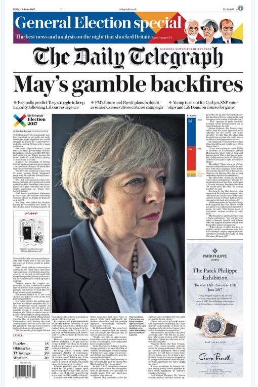«Η Μέι χάνει το μεγάλο της στοίχημα», είναι ο πρωτοσέλιδος τίτλος των Times. Η εφημερίδα υπογραμμίζει ότι το όνειρο της πρωθυπουργού να ενισχύσει την πλειοψηφία της «φαίνεται ότι έγινε συντρίμμια».