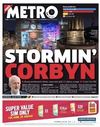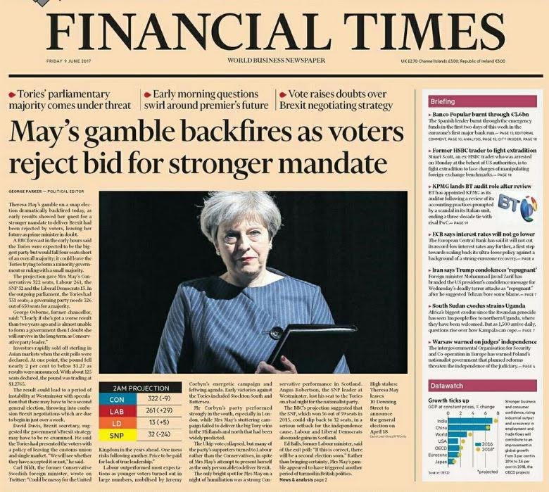 «Προβλέψεις σοκ για τη Μέι», είναι ο τίτλος των εφημερίδων Guardian και Daily Telegraph. «Mayhem» (χάος), είναι ο τίτλος της Sun, που επιλέγει να παίξει με το όνομα της πρωθυπουργού. Η εφημερίδα κάνει λόγο για «καταστροφή» και φοβάται «έναν συνασπισμό του χάους».