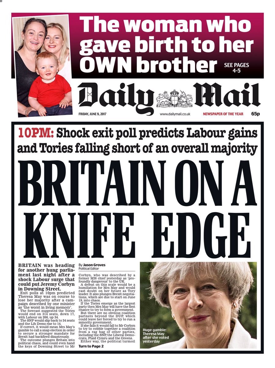 «Ηνωμένο Βασίλειο στην κόψη του ξυραφιού», είναι ο τίτλος της Daily Mail, που κάνει λόγο για μια χώρα βυθισμένη στο πολιτικό χάος» με «ακόμη και την πιθανότητα να δούμε τον Τζέρεμι Κόρμπιν να παίρνει τα κλειδιά της Ντάουνινγκ Στριτ».