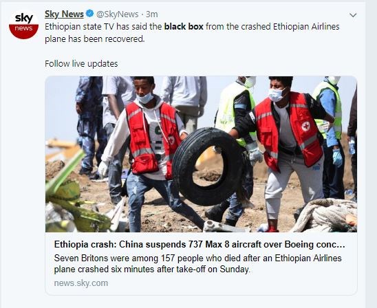 Όπως αναφέρει το Sky news, η κρατική τηλεόραση της Αιθιοπίας μετέδωσε ότι εντοπίστηκε το μαύρο κουτί του αεροσκάφους των Ethiopian Airlines που συνετρίβη την Κυριακή.