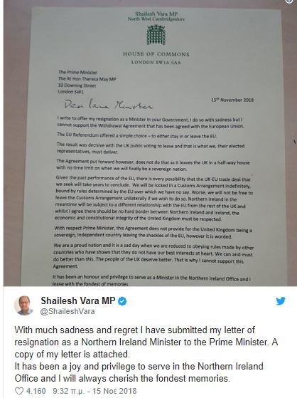 «Δεν μπορώ να υποστηρίξω τη συμφωνία με την Ευρωπαϊκή Ένωση», εξηγεί ο Σέλις Βάρα στην επιστολή παραίτησής του που αναρτήθηκε στο λογαριασμό του στο Twitter.