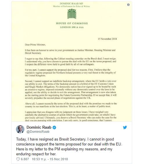 «Λυπούμαι που το λέω αυτό, ύστερα από τη χθεσινή συνεδρίαση του υπουργικού συμβουλίου για τη συμφωνία του Brexit, πρέπει να παραιτηθώ», ανέφερε ο Ράαμπ σε δήλωσή του στο Twitter. Ο Ράαμπ δήλωσε ότι το σχέδιο της Μέι απειλεί την ακεραιότητα του Ηνωμένου Βασιλείου.