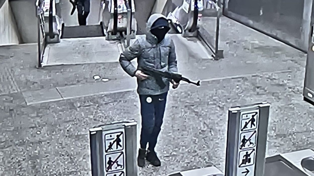 Βίντεο από κλειστό κύκλωμα καμερών ασφαλείας, που εξασφάλισε το Bruxelles Today, δείχνει δύο κουκουλοφόρους υπόπτους να χρησιμοποιούν καλάσνικοφ και να πυροβολούν στον αέρα.