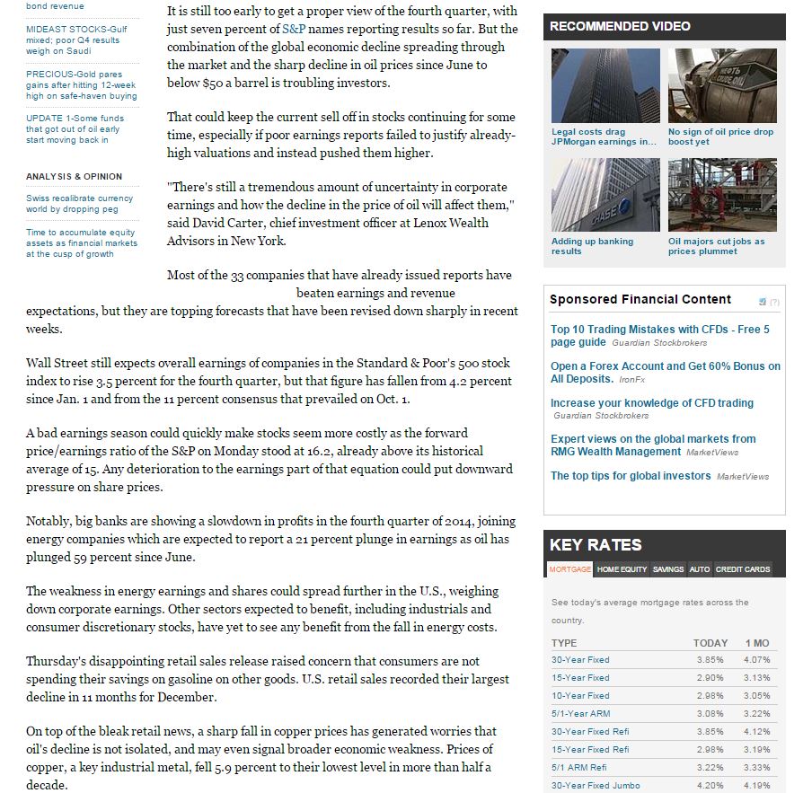 Είναι πολύ νωρίς ακόμη για να υπάρχει μία καλή εικόνα για τα αποτελέσματα του τελευταίου τριμήνου του 2014, καθώς μόνο το 7% των εταιρειών του δείκτη S&P έχουν δημοσιεύσει τους ισολογισμούς τους έως τώρα. Ωστόσο, ο συνδυασμός της παγκόσμιας οικονομικής επιβράδυνσης που διαχέεται στην αγορά και της μεγάλης πτώσης των τιμών πετρελαίου ενοχλεί τους επενδυτές.
