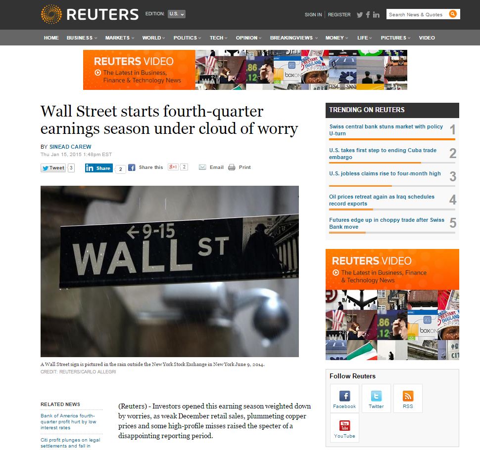 Η Wall Street αναμένει ότι τα κέρδη των εταιρειών του S&P 500 θα αυξηθούν κατά 3,5% για το τέταρτο τρίμηνο του 2014, αλλά το ποσοστό αυτό έχει μειωθεί από 4,2% από την 1η Ιανουαρίου 2015 και 11% από την 1η Οκτωβρίου 2014.