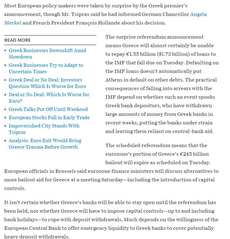 Οι περισσότεροι Ευρωπαίοι αξιωματούχοι πιάστηκαν εξαπίνης από την απόφαση του Αλέξη Τσίπρα να προχωρήσει σε δημοψήφισμα, παρά το γεγονός ότι ο ίδιος είχε ενημερώσει Μέρκελ, Ολαντ και Ντράγκι, αναφέρει η Wall Street Journal.