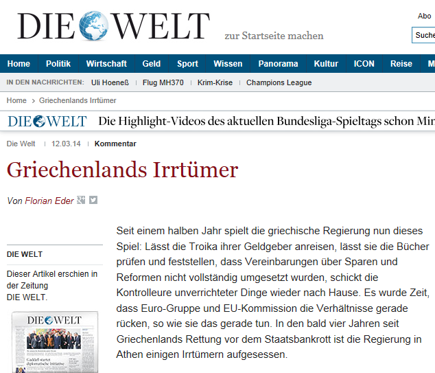 «Εδώ και μισό χρόνο η ελληνική κυβέρνηση παίζει το εξής παιγνίδι: αφήνει την τρόικα των χρηματοδοτών της να έλθει, να ελέγξει τα βιβλία της και να διαπιστώσει ότι τα συμπεφωνημένα για τις περικοπές και τις μεταρρυθμίσεις δεν υλοποιούνται πλήρως και έτσι τους στέλνει και πάλι στα σπίτια τους χωρίς να έχουν καταφέρει τίποτα. Ήταν καιρός, Eurogroup και Κομισιόν, να βάλουν τα πράγματα σε τάξη, όπως το κάνουν τώρα. Στα σχεδόν τέσσερα χρόνια διάσωσης της Ελλάδας από τη χρεωκοπία, η κυβέρνηση στην Αθήνα έχει υποπέσει σε κάποια σφάλματα.