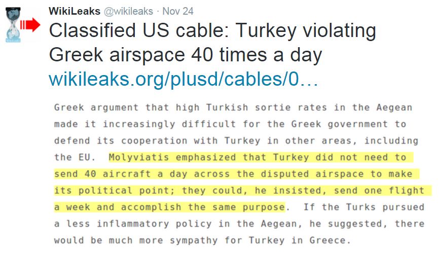 Ένα «εμπιστευτικό» τηλεγράφημα της αμερικανικής πρεσβείας στην Ελλάδα, που εστάλη στην Ουάσινγκτον το 2005, αναφορικά με τις τουρκικές παραβιάσεις του ελληνικού εναέριου χώρου, φέρνει στο φως της δημοσιότητας το Wikileaks.