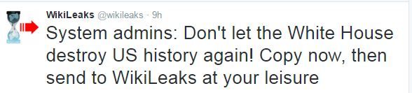 «Ανακοίνωση προς τους διαχειριστές ηλεκτρονικών δεδομένων: μην αφήσετε τον Λευκό Οίκο να καταστρέψει εκ νέου την ιστορία των ΗΠΑ. Κάντε αντιγραφή των εγγράφων τώρα και στείλτε τα στον WikiLeaks όποτε θέλετε”, αναφέρει σε μήνυμά του στο Twitter ο ιστότοπος που εξειδικεύεται στις αποκαλύψεις απόρρητων εγγράφων.