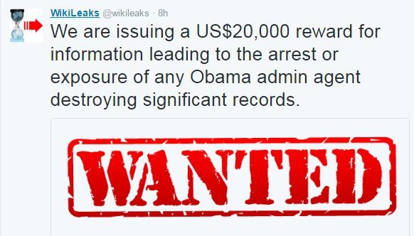 “Προσφέρουμε αμοιβή 20.000 δολαρίων για οποιαδήποτε πληροφορία επιτρέψει τη σύλληψη ή καταδείξει οποιονδήποτε υπάλληλο της κυβέρνησης Ομπάμα ο οποίος κατέστρεψε σημαντικούς φακέλους”, συνεχίζει ο ιστότοπος στο μήνυμά του.