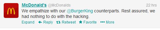 «Συμπάσχουμε με την εταιρεία Burger King. Μείνετε ήσυχοι δεν είχαμε καμία σχέση με το χακάρισμα», ήταν το tweet στον λογαριασμός των McDonald ‘s .