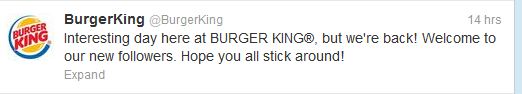 «Είχαμε μία ενδιαφέρουσα ημέρα εδώ στα Burger King, όμως επιστρέψαμε», ήταν το tweet της εταιρείας, όταν ξανάνοιξε ο λογαριασμός στο Twitter.