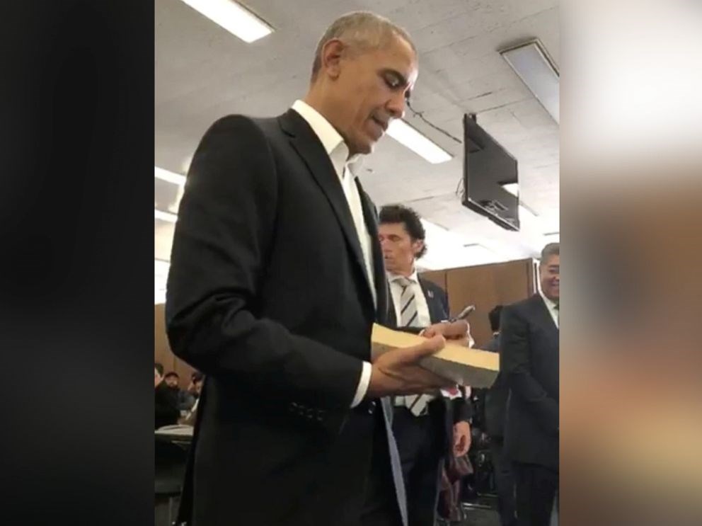 Ο Ομπάμα έφτασε με μια αυτοκινητοπομπή, συνοδευόμενος από τους σωματοφύλακές τους, ενώ έξω από το δικαστήριο τον ανέμεναν αρκετοί Αμερικανοί που ήθελαν να τους υπογράψει το βιβλίο του.