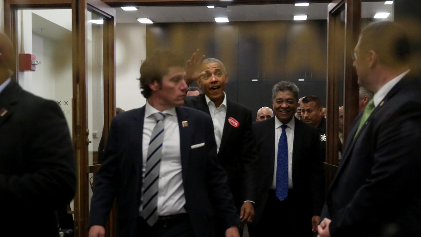 Ο Ομπάμα έφτασε με μια αυτοκινητοπομπή, συνοδευόμενος από τους σωματοφύλακές τους, ενώ έξω από το δικαστήριο τον ανέμεναν αρκετοί Αμερικανοί που ήθελαν να τους υπογράψει το βιβλίο του.