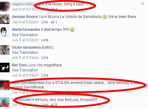 «Η άπτερος νίκη είναι δική μας! Ελληνική!», είναι ένα μόνο από τα δεκάδες σχόλια που έχουν κατακλύσει την επίσημη σελίδα του μουσείου του Λούβρου στο Facebook.