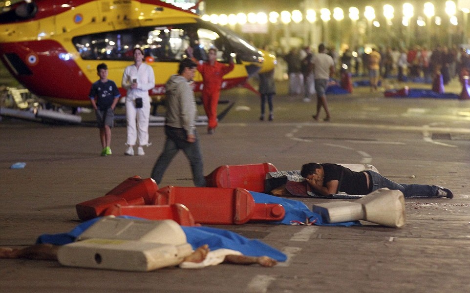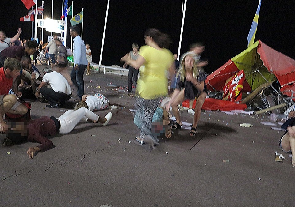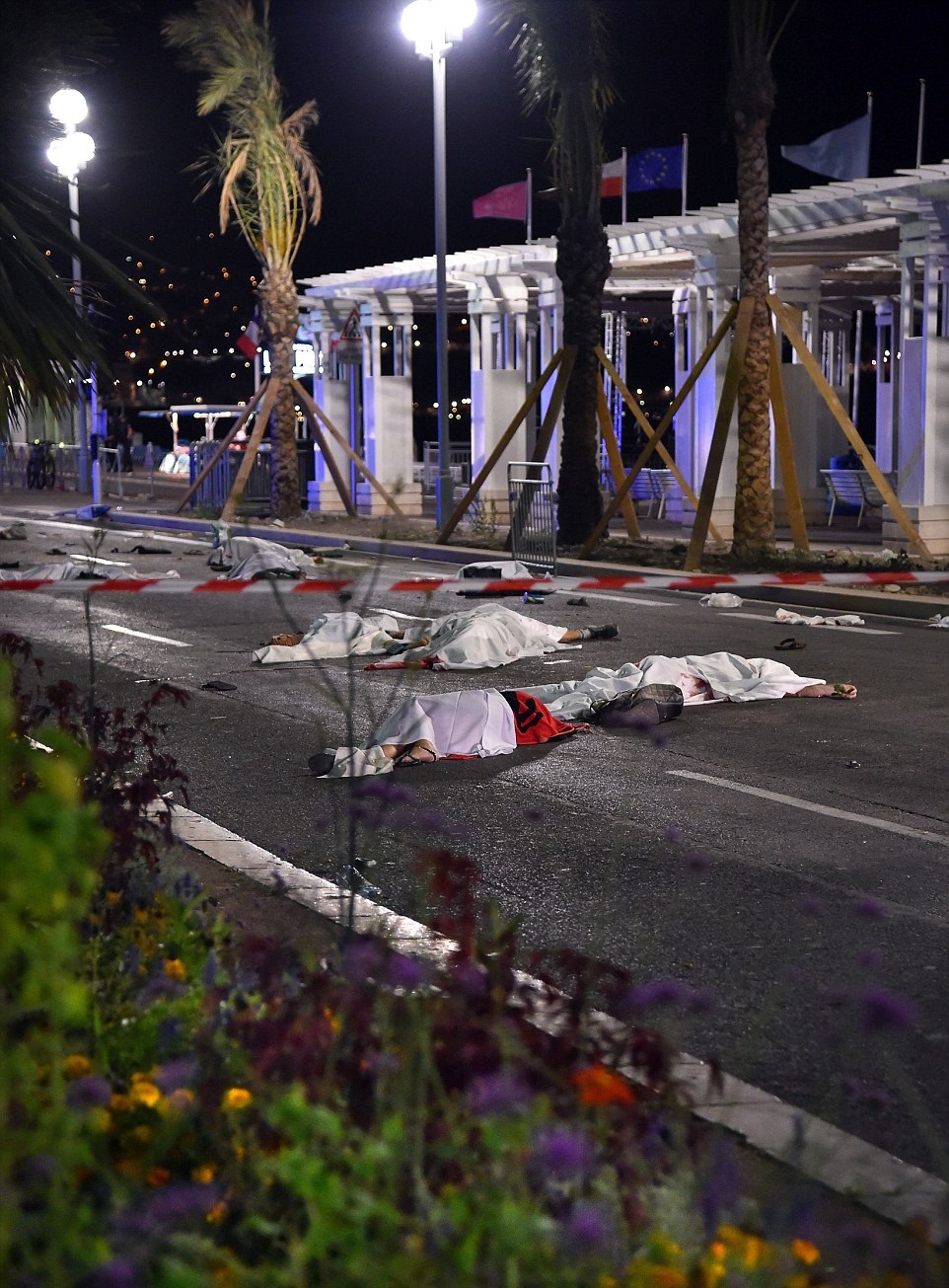Στην Προμενάντ ντεζ Ανγκλέ, τη διάσημη λεωφόρο που εκτείνεται κατά μήκος της Μεσογείου και προσελκύει τουρίστες από όλο τον κόσμο, υπάρχουν πτώματα στο έδαφος, σε σειρά, καλυμμένα με λευκή σημαία, θύματα της πορείας του φορτηγού.