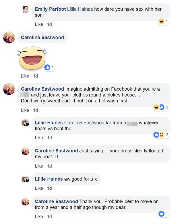 “Ημασταν για λίγο καιρό μαζί, κάτι σαν φίλοι με προνόμια” είπε η Λίλι Χέινς από το Χαμφσάιρ εξηγώντας πώς άφησε το φόρεμά της στην κρεβατοκάμαρά του. Η Καρολάιν Ίστγουντ ειρωνεύτηκε τη Λίλι λέγοντας ότι μάλλον ζηλεύει που καταφέρνει αν και σχεδόν 20 χρόνια μεγαλύτερή της να φορά το ίδιο φόρεμα και μάλιστα να της πηγαίνει καλύτερα απ’ ό,τι στην ίδια τη Λίλι, η οποία έγινε μπαρούτι και της απάντησε ότι ενώ φορούσε αυτό το φόρεμα είχε κάνει σεξ με τον γιο της. Η κόντρα συνεχίστηκε με βαριές εκφράσεις εκατέρωθεν.