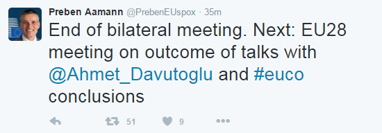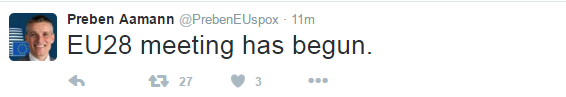 Ξεκινάει η Σύνοδος Κορυφής των “28” με τον Τούρκο Πρωθυπουργό Αχμέτ Νταβούτογλου για το προσφυγικό, έγραψε στο Twitter ο εκπρόσωπος του Πρόεδρου του Ευρωπαϊκού Συμβουλίου Ντόναλντ Τουσκ.