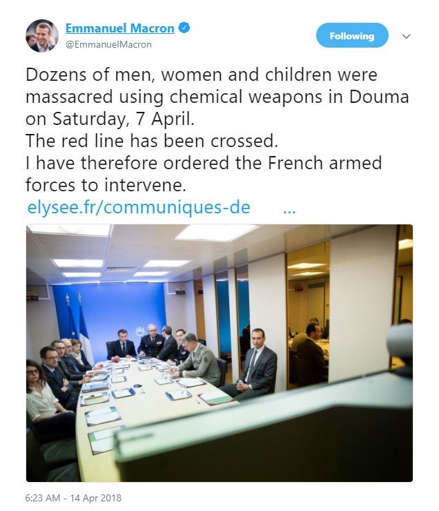 Ο Γάλλος πρόεδρος εμφανίζεται σε φωτογραφία που ανήρτησε στο Twitter, επικεφαλής σύσκεψης στρατιωτικών και συνεργατών του σε αίθουσα επιχειρήσεις, παρακολουθώντας την εξέλιξη της επίθεσης που εξαπολύθηκε από ΗΠΑ, Βρετανία και Γαλλία.