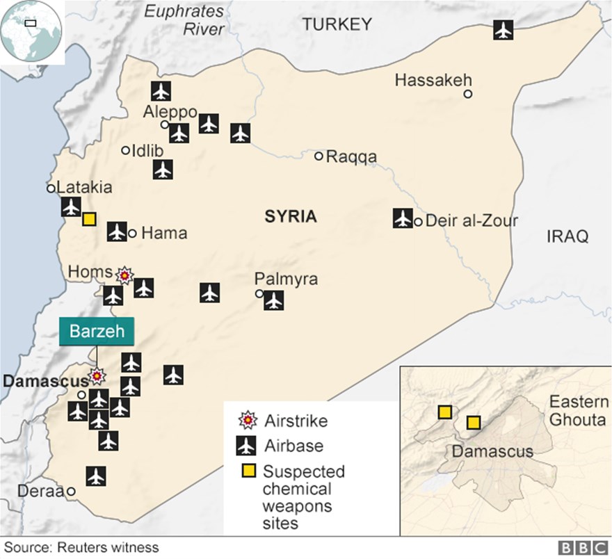 Στόχος των βομβαρδισμών «ακριβείας» είναι θέσεις που σχετίζονται με τις χημικές οπλικές δυνατότητες του καθεστώτος Άσαντ, δήλωσε ο Αμερικανός πρόεδρος Ντόναλντ Τραμπ. Έως τώρα έχει γίνει γνωστό πως επλήγησαν ένα ερευνητικό κέντρο στην πρωτεύουσα Δαμασκό, και τουλάχιστον δύο στρατιωτικές αποθήκες κοντά στην πόλη Χομς.