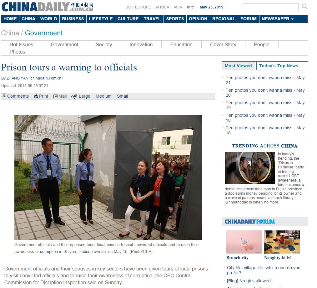 Η China Daily είπε ότι φωτογραφίες των ανακρίσεων είναι αναρτημένες στους τοίχους της φυλακής προς συμμόρφωση. “Είναι εντυπωσιακό να έχει παρακολουθήσει κανείς τη βαθιά μεταμέλεια των πρώην αξιωματούχων ενώ εκτίουν την ποινή τους στη φυλακή”, είπε στην εφημερίδα έναν αξιωματούχο της περιφέρειας Χουμπέι.