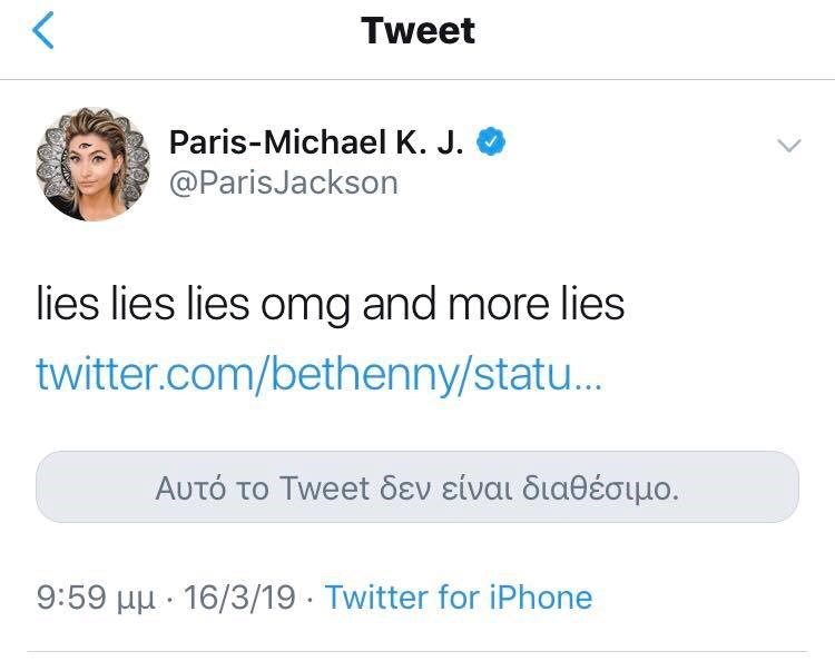 Σάλος έχει προκληθεί με δημοσίευμα του σκανδαλοθηρικού TMZ που αναφέρει, ως αποκλειστική είδηση, την οποία αναπαράγουν πολλά διεθνή μέσα, πως η κόρη του Μάικλ Τζάκσον, Πάρις νοσηλεύτηκε σε νοσοκομείο έπειτα από απόπειρα αυτοκτονίας.Όπως ισχυρίζεται το TMZ, επικαλούμενο πηγές της οικογένειάς της, η Πάρις επιχείρησε να δώσει τέλος στη ζωή της έπειτα από τις αποκαλύψεις του πολυσυζητημένου ντοκιμαντέρ «Leaving Neverland» που παρουσιάζει τον πατέρα της ως παιδόφιλο.Ωστόσο η ίδια η Πάρις, θέλησε να βάλει τέλος στην συγκεκριμένη παραφιλολογία και δημοσίευσε το ακόλουθο tweet:«Ψέματα ψέματα ψέματα Θεέ μου και άλλα ψέματα…».Όμως δεν αρκέστηκε μόνο στον συγκεκριμένο μέσο κοινωνικής δικτύωσης, καθώς λίγη ώρα αργότερα δημοσίευσε Instastory με το πρόσωπό της, σχολιάζοντας:«Άντε γ@@@@@… , χαλαρώνω όπως ο Bob Dylan». Δείτε τι έγραψε: