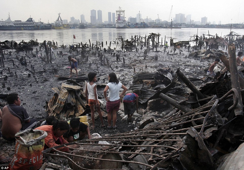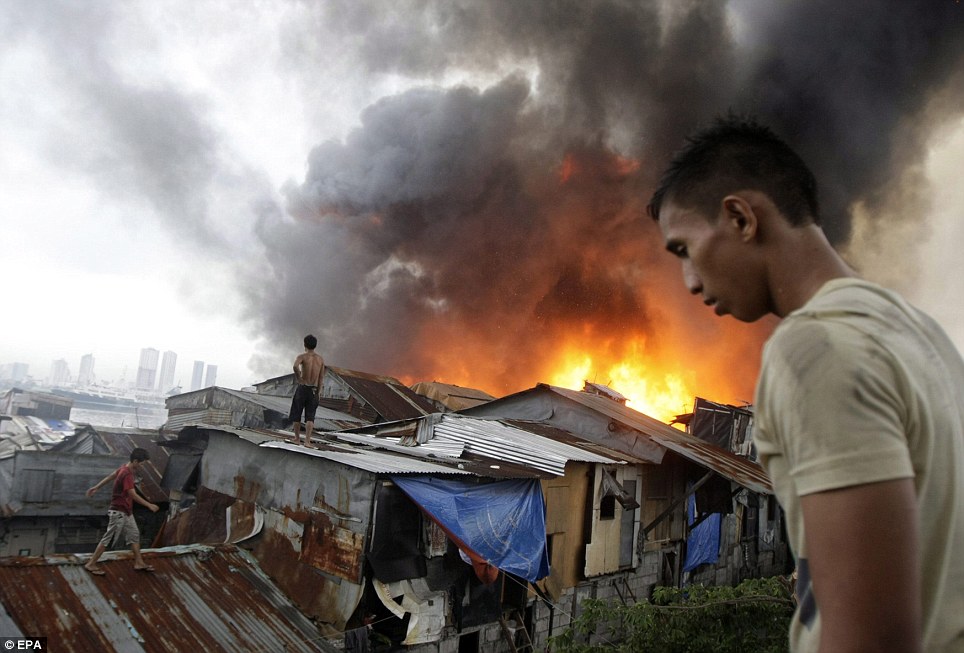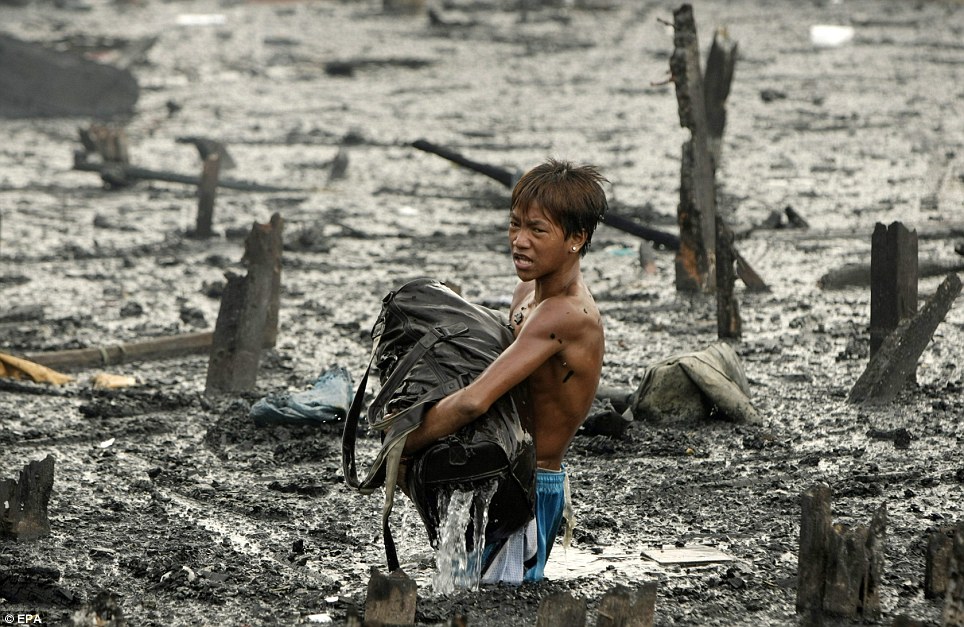 Απελπισμένοι επιζώντες προσπαθούν να διασώσουν τα υπάρχοντά τους, έπειτα από πυρκαγιά που εκδηλώθηκε σε παραγκούπολη στη Μανίλα, στις Φιλιππίνες.Δυο άνθρωποι αγνοούνται και 10.000 είναι πλέον άστεγοι μετά από την πυρκαγιά της Παρασκευής.Αρκετοί από τους επιζώντες, πήδηξαν μέσα στον κόλπο, βουτηγμένοι μέχρι το λαιμό για να ξεφύγουν από τις φλόγες και για να διαδώσουν τα πράγματά τους. Οι περισσότεροι από αυτούς ζούσαν σε ξύλινες καλύβες, οι οποίες έχουν καεί ολοσχερώς.Τα αίτια της πυγκαγιάς, δεν έχουν γίνει ακόμα γνωστά.