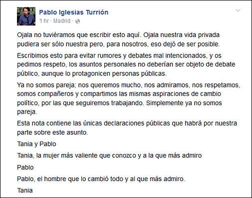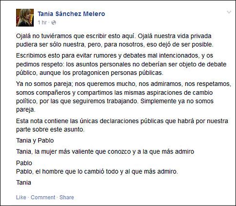 Το τέλος της σχέσης τους ανακοίνωσαν μέσω των προσωπικών τους λογαριασμών στο Facebook, ο ηγέτης των Podemos Πάμπλο Ιγκλέσιας και η σύντροφός του, η οποία είναι επίσης πολιτικός, Τάνια Σάντσεθ Μελέρο.