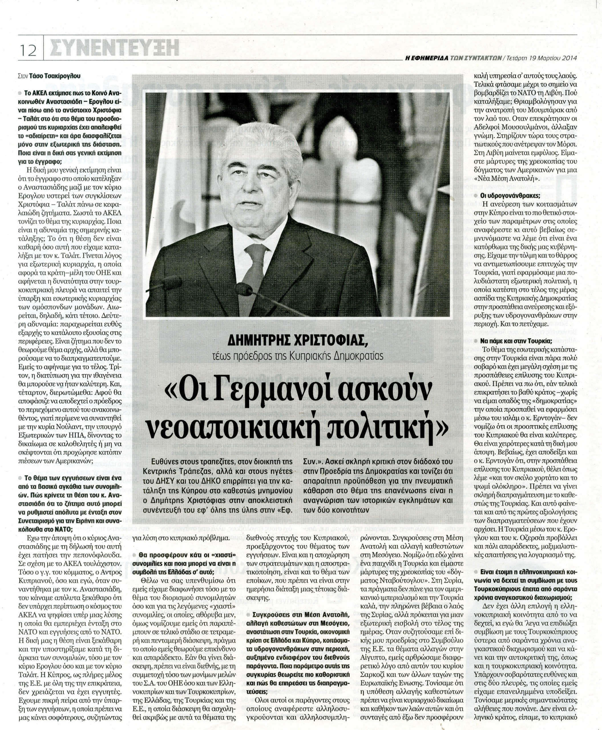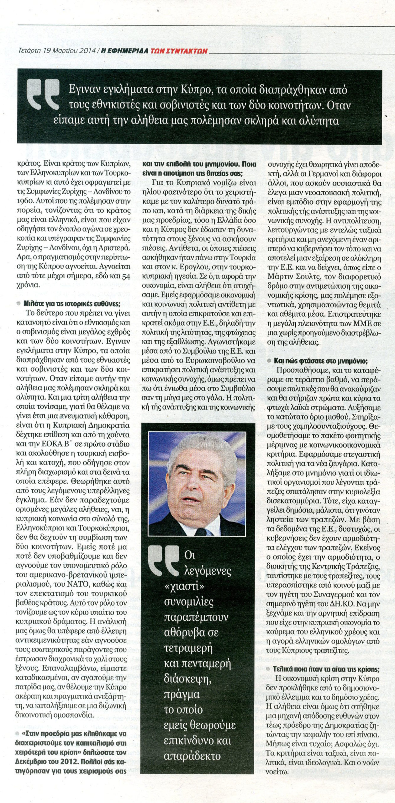 Ο τέως πρόεδρος της Κυπριακής Δημοκρατίας, Δημήτρης Χριστόφιας, στην αποκλειστική του συνέντευξη εφ’ όλης της ύλης στην “Εφημερίδα των Συντακτών”, επιρρίπτει ευθύνες στους τραπεζίτες αλλά και στους ηγέτες του ΔΗΣΥ και του ΔΗΚΟ για το μνημόνιο που επιβλήθηκε στην Κύπρο και ασκεί σκληρή κριτική στον διάδοχό του στον προεδρικό θώκο.