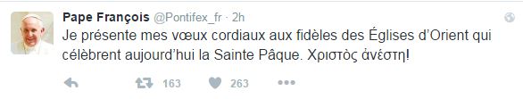 “Απευθύνω τις εγκάρδιες ευχές μου στους πιστούς των Ανατολικών Εκκλησιών που γιορτάζουν το Άγιο Πάσχα σήμερα. Χριστὸς ἀνέστη”, έγραψε ο Πάπας στο Twitter.