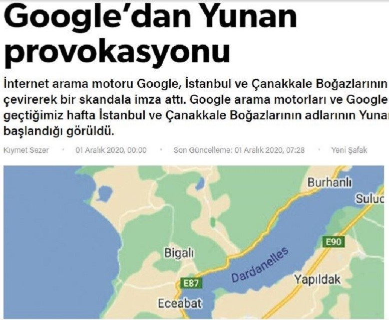 Ο… αρθρογράφος επισημαίνει ότι η δημοφιλής μηχανή αναζήτησης και οι χάρτες της (Google Maps) «συνυπογράφουν ένα σκάνδαλο» καθώς αναγράφουν τα Δαρδανέλια και το Βόσπορο με τις ελληνικές ονομασίας. Και όλα αυτά μετά την τοποθέτηση του τέως υπαρχηγού του ΠΝ της γείτονος, Τζιχάτ Γιαϊτζί, ο οποίος επιτέθηκε στη Google, αλλά και στην Ελλάδα.