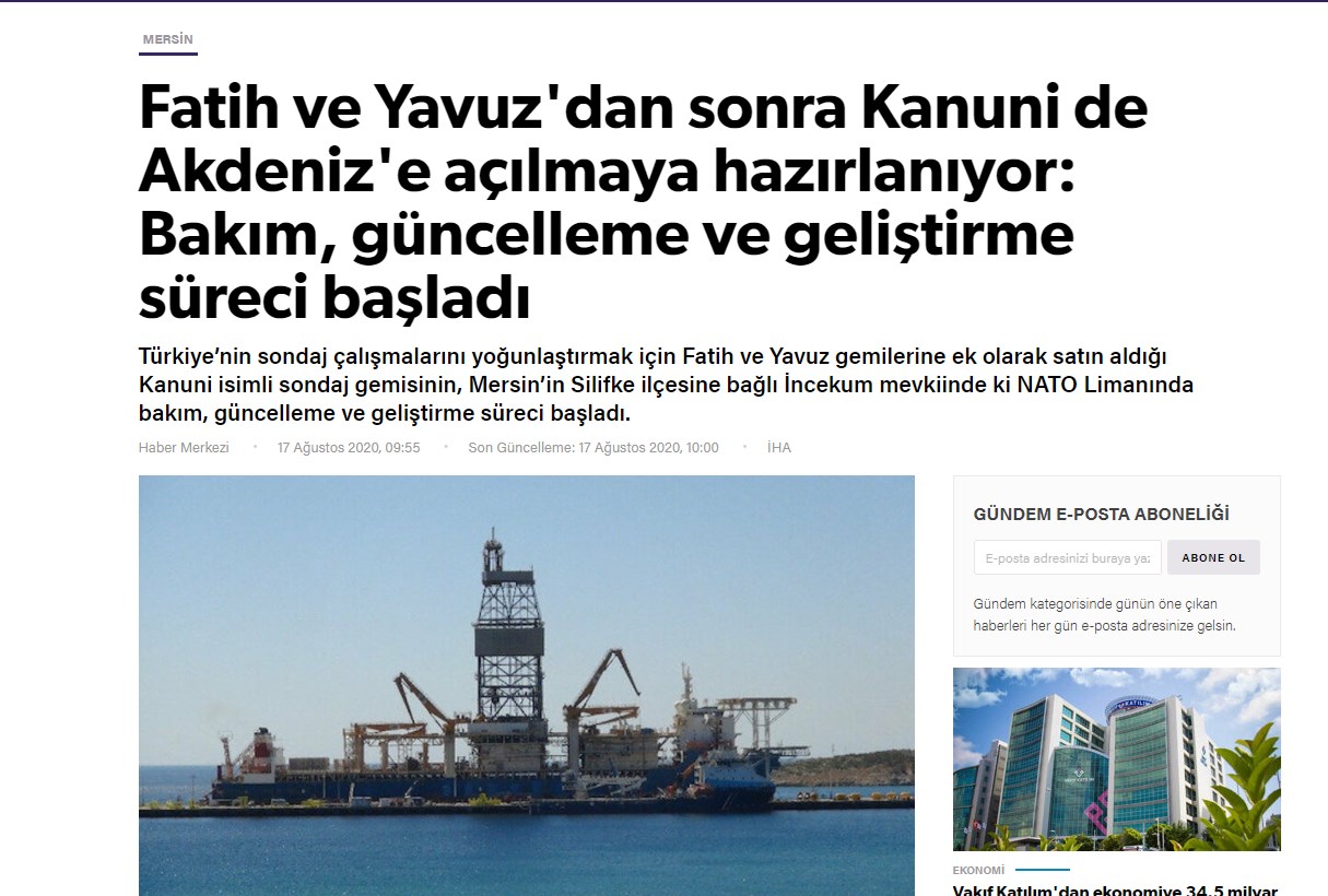 Σύμφωνα με την Yeni Safak, πρόκειται για το πλωτό γεωτρύπανο “Kanuni” το οποίο είναι το τελευταίο που έχει αγοράσει η Τουρκία και έχει ικανότητα γεώτρησης σε βάθος 11.400 μέτρων. Είναι το τρίτο μεγαλύτερο που διαθέτει η Άγκυρα δηλαδή μικρότερο από το “Fatih” και το “Yavuz”.