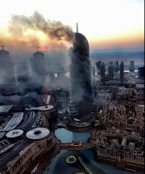 Στήλες λευκού καπνού υψώνονταν ακόμη από το ξενοδοχείο Address Downtown Dubai, 63 ορόφων, και το οικιστικό οικοδομικό τετράγωνο την αυγή, ωστόσο τα πληρώματα της πολιτικής προστασίας έσβησαν στο μεγαλύτερο μέρος της τη φωτιά που ξέσπασε γύρω στις 21:30 (19:30 ώρα Ελλαδας).