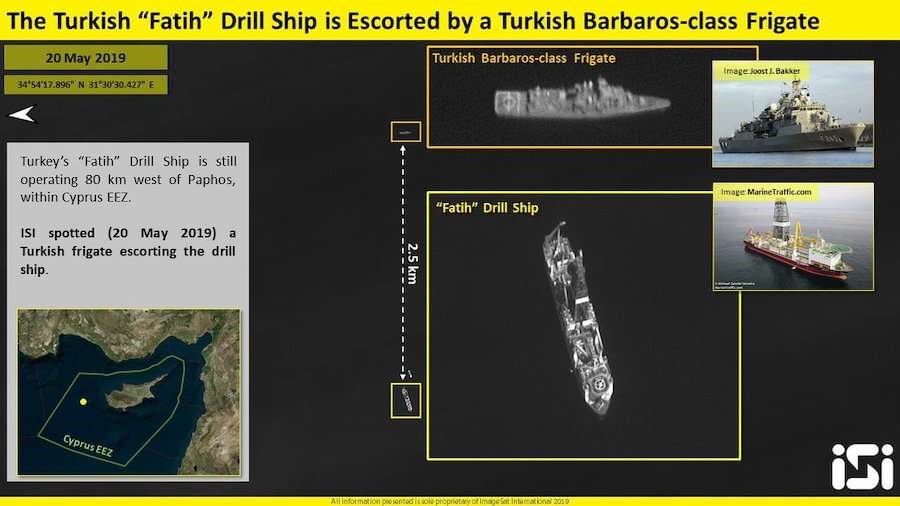 Οι τουρκικές κινήσεις πέριξ της Κύπρου βρίσκονται υπό διαρκή ισραηλινή παρακολούθηση. Η φωτογραφία προέρχεται από τον ισραηλινό δορυφόρο της εταιρείας ISI και δείχνει ότι κοντά στο γεωτρύπανο Πορθητής πλέει μία φρεγάτα του τουρκικού ναυτικού.