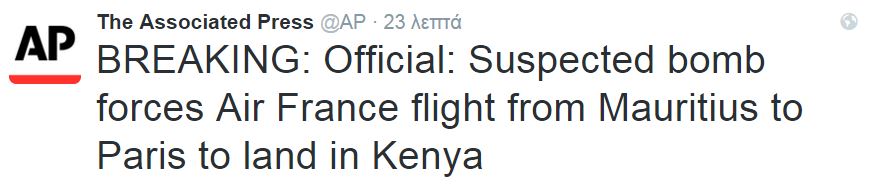 Αναγκαστική προσγείωση πραγματοποίησε αεροσκάφος της Air France, το οποίο πετούσε από τον Μαυρίκιο στο Παρίσι, λόγω υποψίας για βόμβα. Σύμφωνα με το Αssociated Press το αεροσκάφος προσγειώθηκε στην Κένυα.